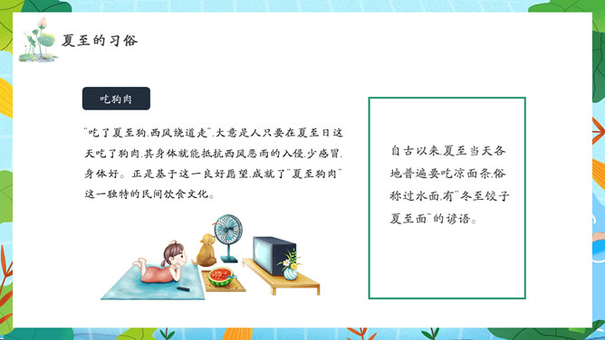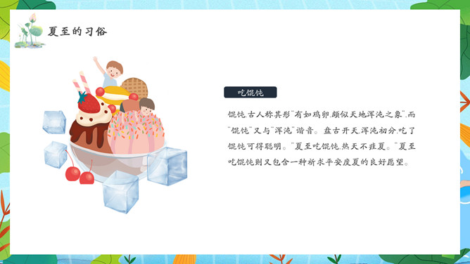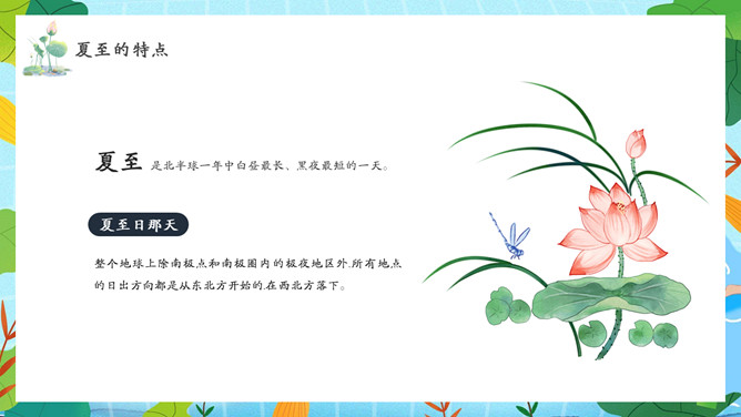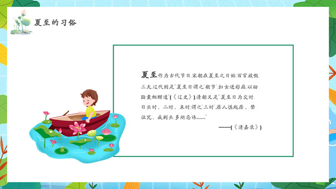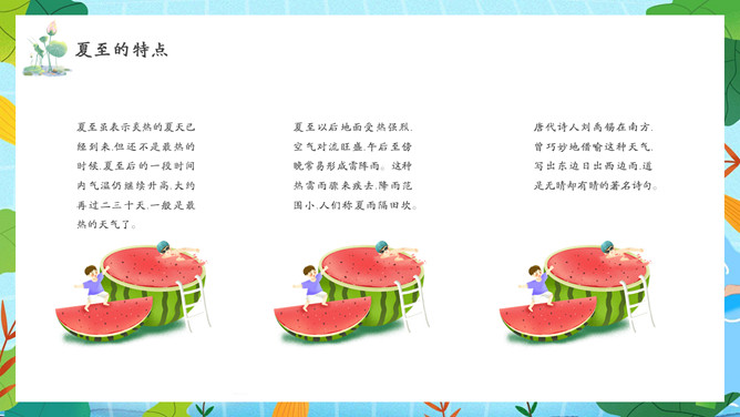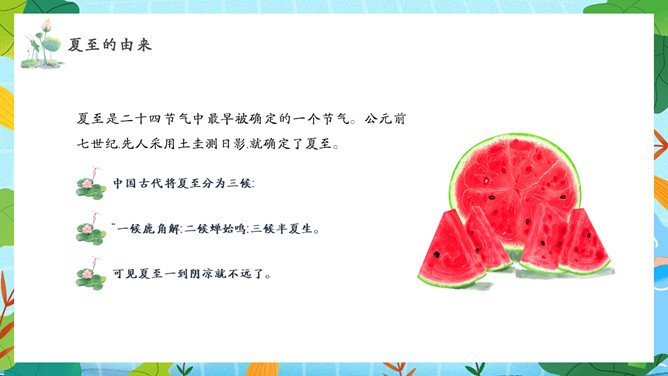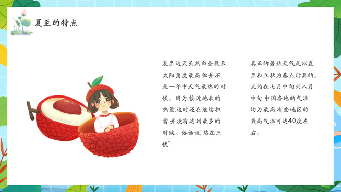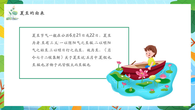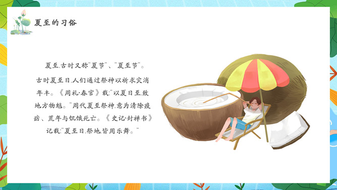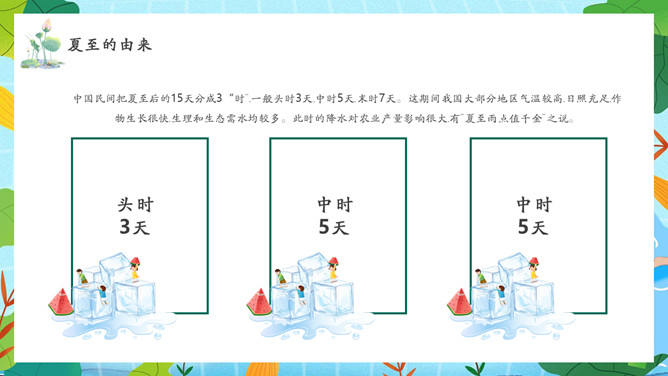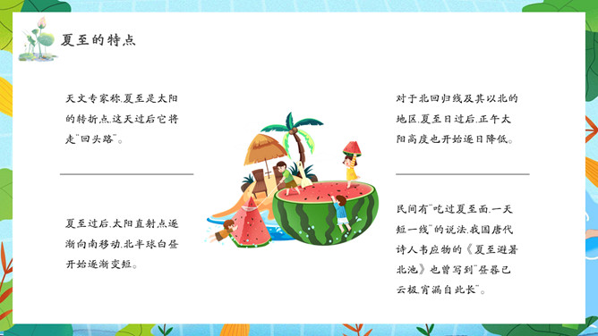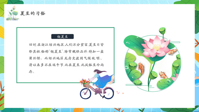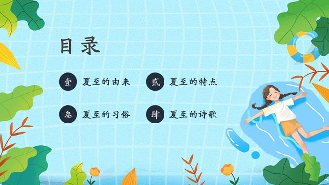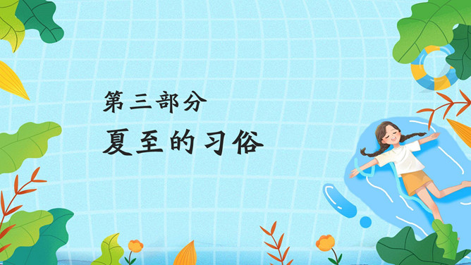 夏天女孩夏至节气PPT模板abby1年前发布关注私信066713夏天女孩夏至节气PPT模板此内容为付费资源,请付费后查看R1黄金会员免费钻石会员免费立即购买您当前未登录!建议登陆后购买,可保存购买订单付费资源已售 10 夏天女孩夏至节气PPT模板。民间有“吃过夏至面,一天短一线”的说法,我国唐代诗人韦应物的《夏至避暑北池》也曾写到“昼晷已云极,宵漏自此长”。 © 版权声明文章版权归作者所有,未经允许请勿转载。THE END节目ppt 喜欢就支持一下吧点赞13 分享QQ空间微博QQ好友海报分享复制链接收藏
