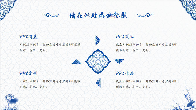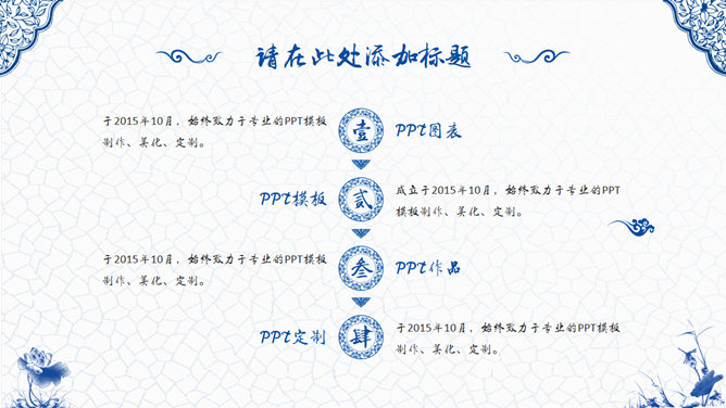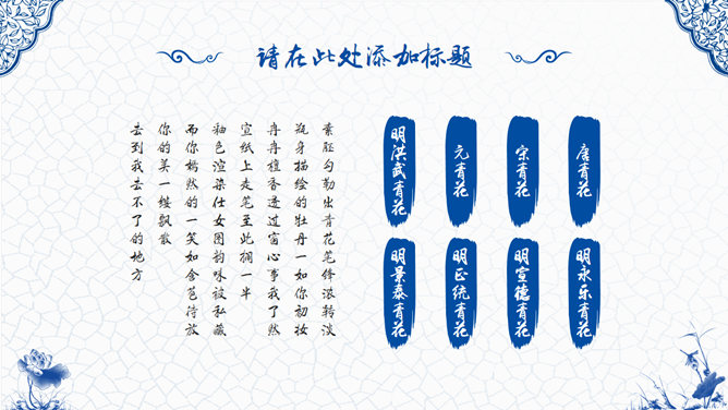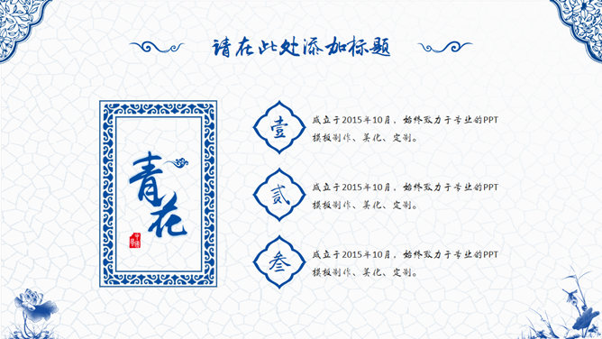 精美中国风青花瓷PPT模板abby1年前发布关注私信034112精美中国风青花瓷PPT模板此内容为付费资源,请付费后查看R1黄金会员免费钻石会员免费立即购买您当前未登录!建议登陆后购买,可保存购买订单付费资源已售 6 精美中国风青花瓷PPT模板。一套古典中国风幻灯片模板,青花瓷效果设计。使用字体:李旭科书法、腾祥铁山楷书简。 © 版权声明文章版权归作者所有,未经允许请勿转载。THE ENDPPT模版 喜欢就支持一下吧点赞12 分享QQ空间微博QQ好友海报分享复制链接收藏
