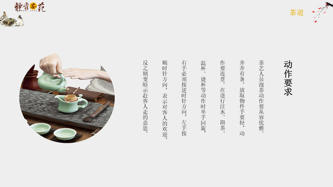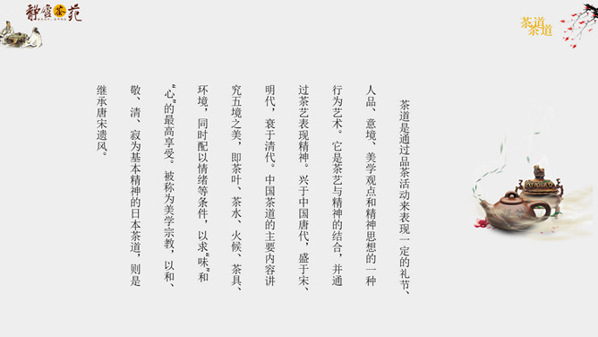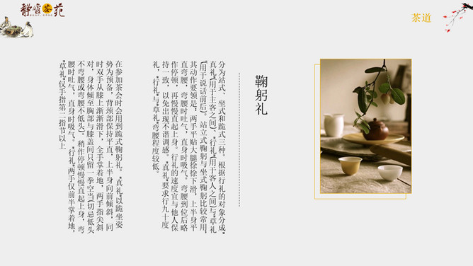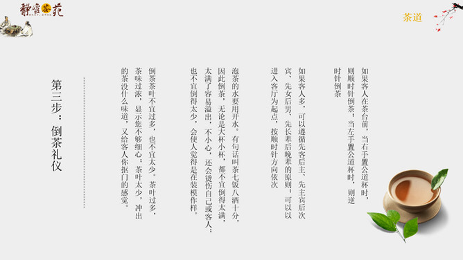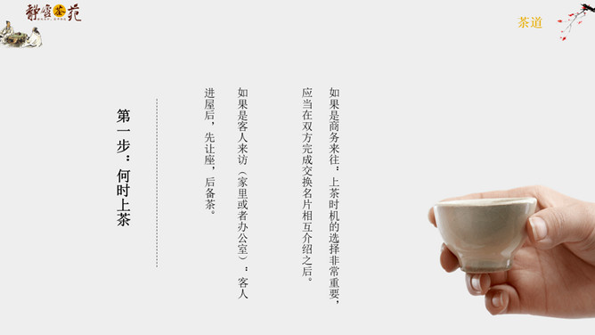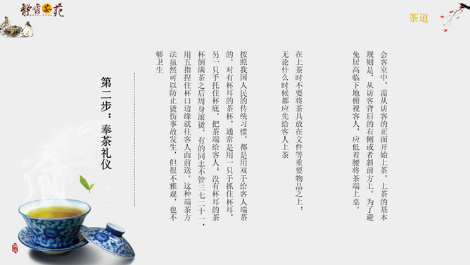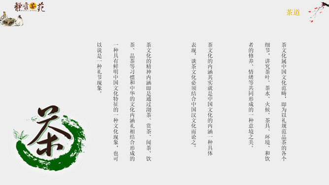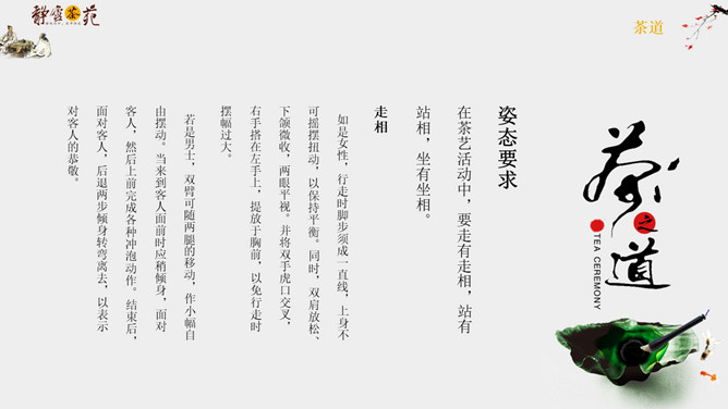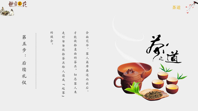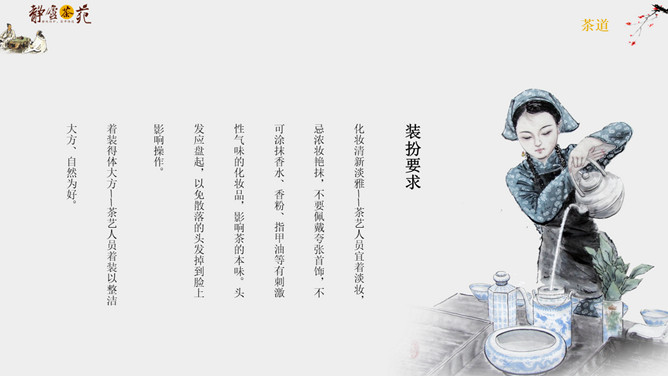 茶道文化礼仪介绍PPT模板abby1年前发布关注私信04395茶道文化礼仪介绍PPT模板此内容为付费资源,请付费后查看R1黄金会员免费钻石会员免费立即购买您当前未登录!建议登陆后购买,可保存购买订单付费资源已售 8 茶道文化礼仪介绍PPT模板。一套茶道文化介绍幻灯片模板,简约设计,包括简介、接待礼仪和品茶礼仪等内容。 © 版权声明文章版权归作者所有,未经允许请勿转载。THE ENDPPT模版 喜欢就支持一下吧点赞5 分享QQ空间微博QQ好友海报分享复制链接收藏