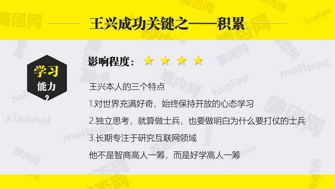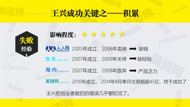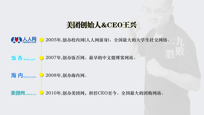 《九败一胜》读书笔记PPTabby1年前发布关注私信07769《九败一胜》读书笔记PPT此内容为付费资源,请付费后查看R1黄金会员免费钻石会员免费立即购买您当前未登录!建议登陆后购买,可保存购买订单付费资源已售 4 《九败一胜》读书笔记PPT。美团创始人&CEO王兴,100+亿美金堆出来的经验教训,到底他成功源于哪些因素? © 版权声明文章版权归作者所有,未经允许请勿转载。THE ENDPPT模版 喜欢就支持一下吧点赞9 分享QQ空间微博QQ好友海报分享复制链接收藏