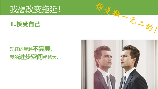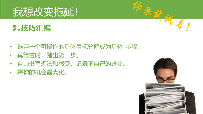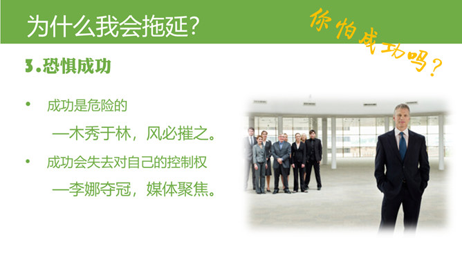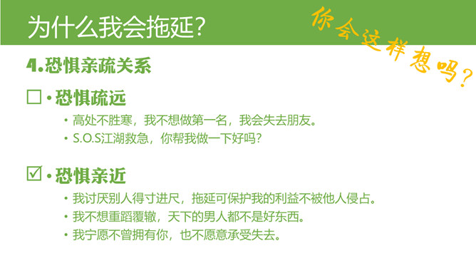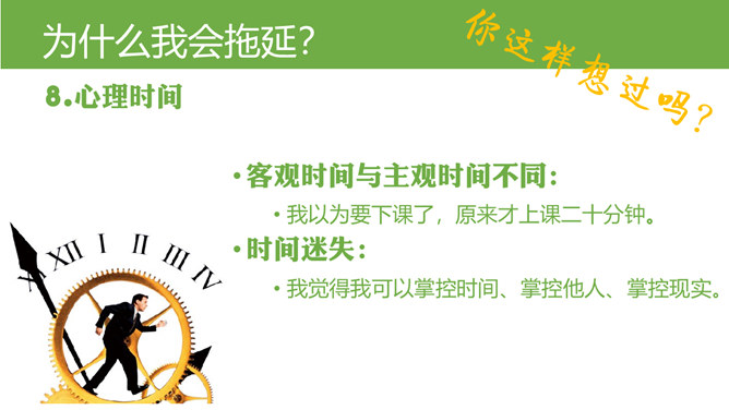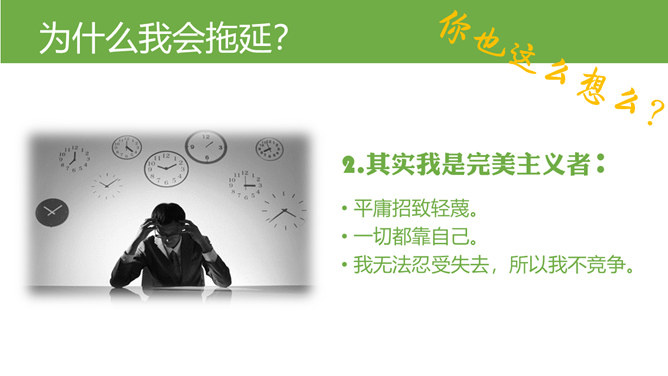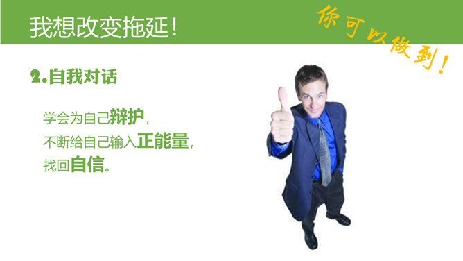 《拖延心理学》读书笔记PPTabby1年前发布关注私信018301《拖延心理学》读书笔记PPT此内容为付费资源,请付费后查看R1黄金会员免费钻石会员免费立即购买您当前未登录!建议登陆后购买,可保存购买订单付费资源已售 18 《拖延心理学》读书笔记PPT。拖延定义:“推迟到明天再做”。拖延的特征:常由于拖延而失去原本可把握住的机会。常为拖延而感到焦虑痛苦。常难以自我约束。 © 版权声明文章版权归作者所有,未经允许请勿转载。THE ENDPPT模版 喜欢就支持一下吧点赞1 分享QQ空间微博QQ好友海报分享复制链接收藏
