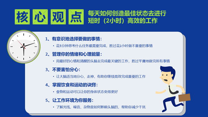 《每天最重要的2小时》读书笔记PPTabby1年前发布关注私信0234623《每天最重要的2小时》读书笔记PPT此内容为付费资源,请付费后查看R1黄金会员免费钻石会员免费立即购买您当前未登录!建议登陆后购买,可保存购买订单付费资源已售 4 《每天最重要的2小时》读书笔记PPT。该书从生理角度出发,应用5种策略使人更高效,以应对每天的繁忙任务。这是精力管理的进阶,看似简单甚至是常识,却往往被忽略。 © 版权声明文章版权归作者所有,未经允许请勿转载。THE ENDPPT模版 喜欢就支持一下吧点赞23 分享QQ空间微博QQ好友海报分享复制链接收藏