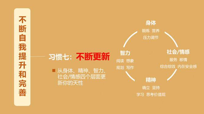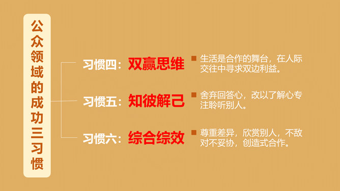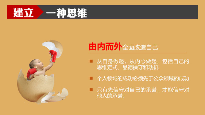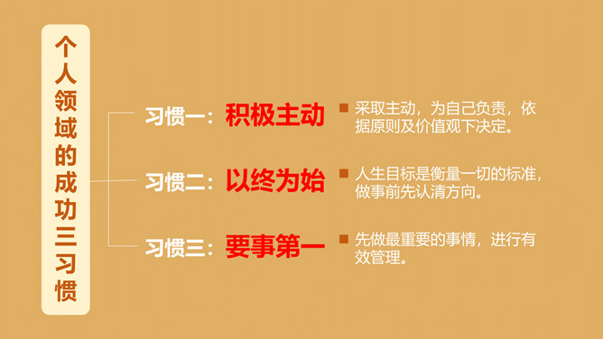 《高效能人士的7个习惯》读书笔记PPTabby1年前发布关注私信0164324《高效能人士的7个习惯》读书笔记PPT此内容为付费资源,请付费后查看R1黄金会员免费钻石会员免费立即购买您当前未登录!建议登陆后购买,可保存购买订单付费资源已售 6 《高效能人士的7个习惯》读书笔记PPT。从自身做起,从内心做起,包括自己的思维定式、品德操守和动机。个人领域的成功必须先于公众领域的成功。只有先信守对自己的承诺,才能信守对他人的承诺。 © 版权声明文章版权归作者所有,未经允许请勿转载。THE ENDPPT模版 喜欢就支持一下吧点赞24 分享QQ空间微博QQ好友海报分享复制链接收藏
