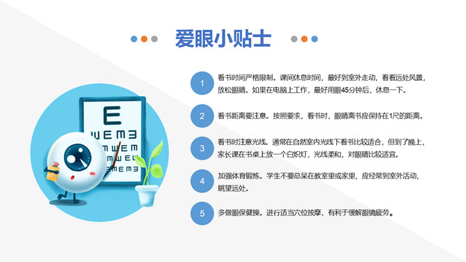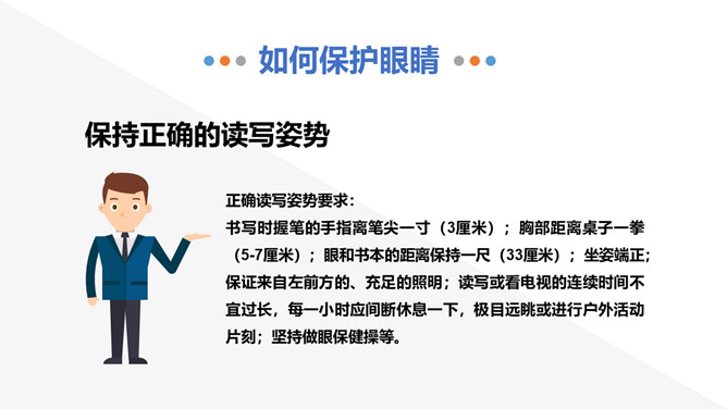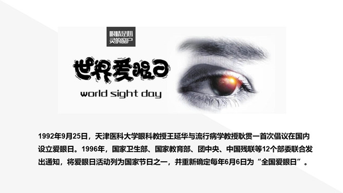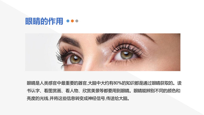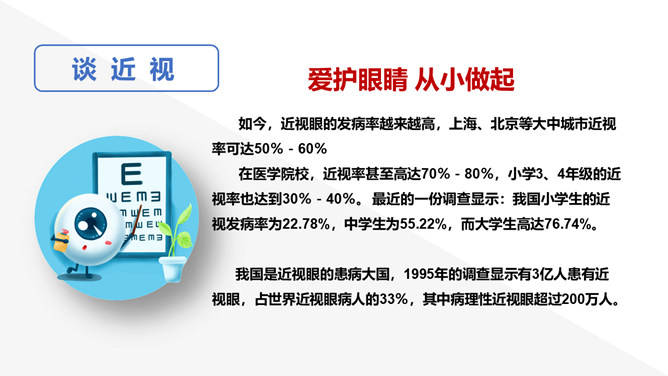 保护视力预防近视班会PPT模板abby1年前发布关注私信0144319保护视力预防近视班会PPT模板此内容为付费资源,请付费后查看R1黄金会员免费钻石会员免费立即购买您当前未登录!建议登陆后购买,可保存购买订单付费资源已售 4 眼睛是人类感官中最重要的器官,大脑中大约有80%的知识都是通过眼睛获取的。读书认字、看图赏画、看人物、欣赏美景等都要用到眼睛。眼睛能辨别不同的颜色和亮度的光线,并将这些信息转变成神经信号,传送给大脑。 © 版权声明文章版权归作者所有,未经允许请勿转载。THE ENDPPT模版 喜欢就支持一下吧点赞19 分享QQ空间微博QQ好友海报分享复制链接收藏