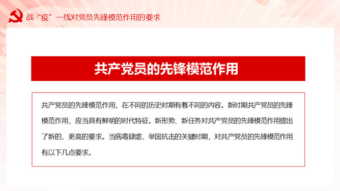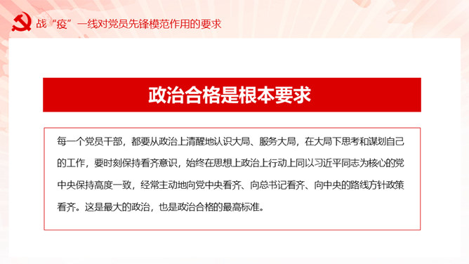 做新时代硬核共产党员PPT模板abby1年前发布关注私信03513做新时代硬核共产党员PPT模板此内容为付费资源,请付费后查看R1黄金会员免费钻石会员免费立即购买您当前未登录!建议登陆后购买,可保存购买订单付费资源已售 19 做新时代硬核共产党员PPT模板。深刻领会什么是共产党人的先锋模范作用,战疫一线对党员先锋模范作用的要求,战疫一线如何发挥党员先锋模范作用,守初心担使命打赢疫情防控阻击战。 © 版权声明文章版权归作者所有,未经允许请勿转载。THE ENDPPT模版 喜欢就支持一下吧点赞3 分享QQ空间微博QQ好友海报分享复制链接收藏
