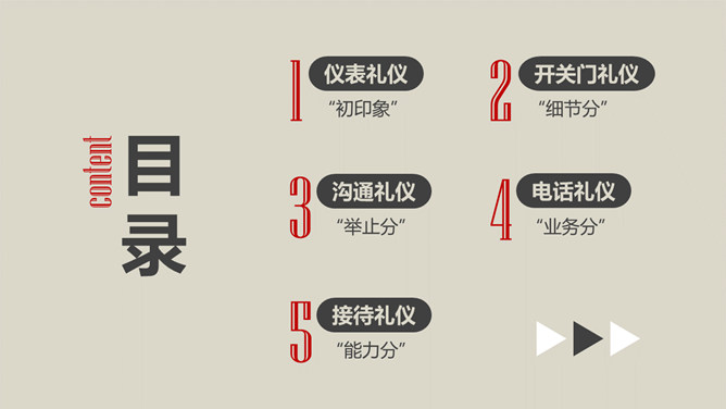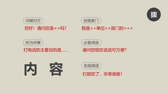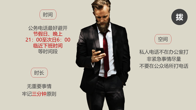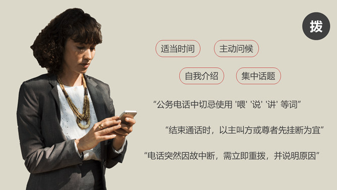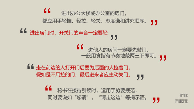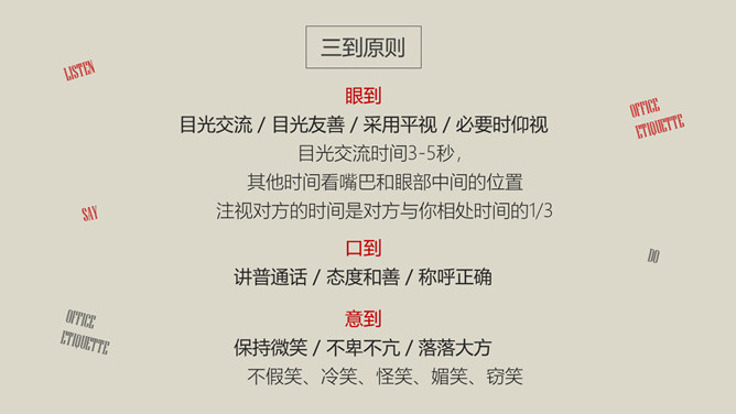 办公室礼仪培训PPT课件模板abby1年前发布关注私信036521办公室礼仪培训PPT课件模板此内容为付费资源,请付费后查看R1黄金会员免费钻石会员免费立即购买您当前未登录!建议登陆后购买,可保存购买订单付费资源已售 10 办公室礼仪培训PPT课件模板。包括仪表礼仪、开关门礼仪、沟通礼仪、电话礼仪、接待礼仪几个部分。 © 版权声明文章版权归作者所有,未经允许请勿转载。THE ENDPPT模版 喜欢就支持一下吧点赞21 分享QQ空间微博QQ好友海报分享复制链接收藏