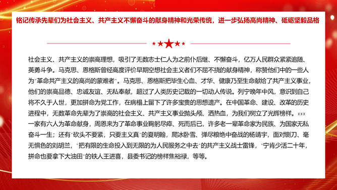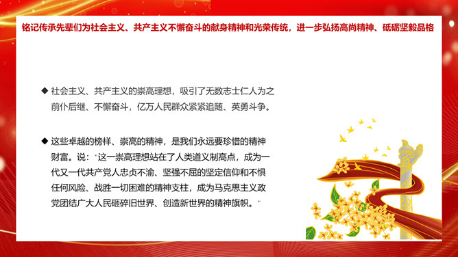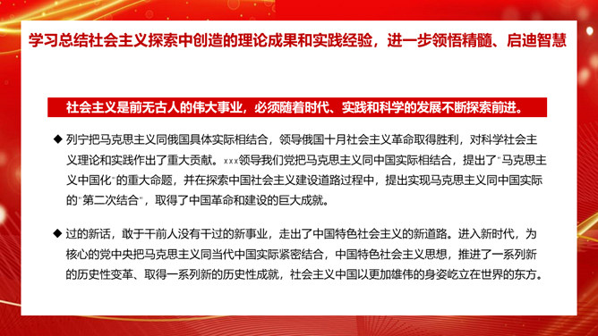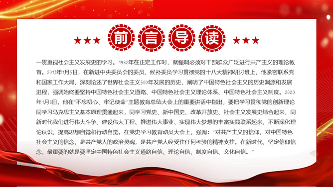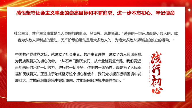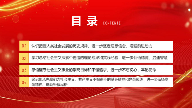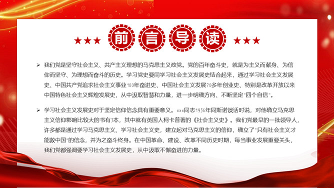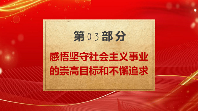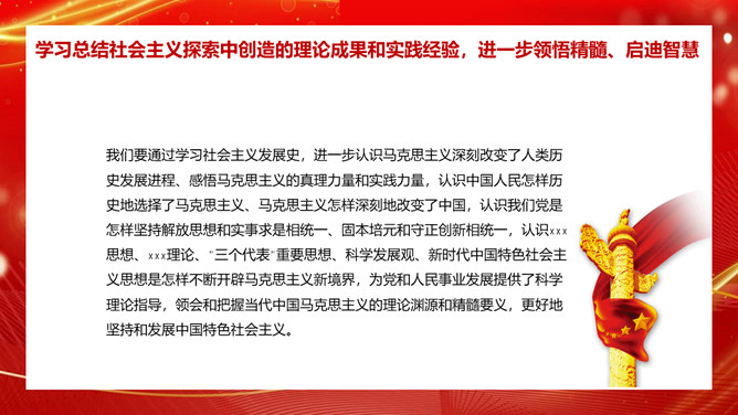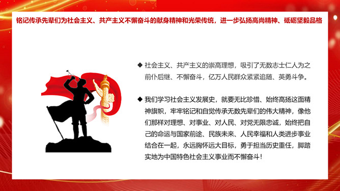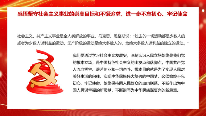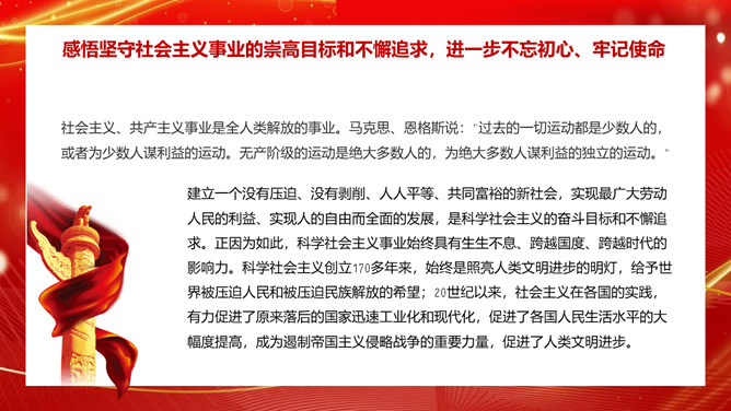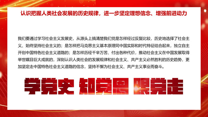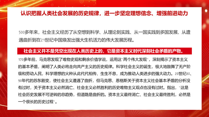 学习社会主义发展史不断坚定“四个自信”PPT模板。内容包括认识把握人类社会发展的历史规律,进一步坚定理想信念、增强前进动力。学习总结社会主义探索中创造的理论成果和实践经验,进一步领悟精髓、启迪智慧。感悟坚守社会主义事业的崇高目标和不懈追求,进一步不忘初心、牢记使命。铭记传承先辈们为社会主义、共产主义不懈奋斗的献身精神和光荣传统,进一步弘扬高尚精神、砥砺坚毅品格。