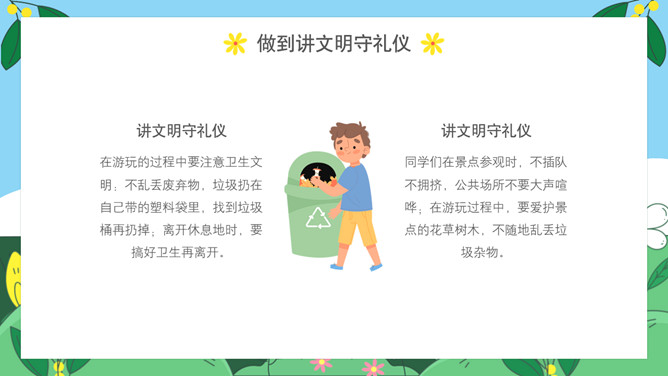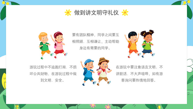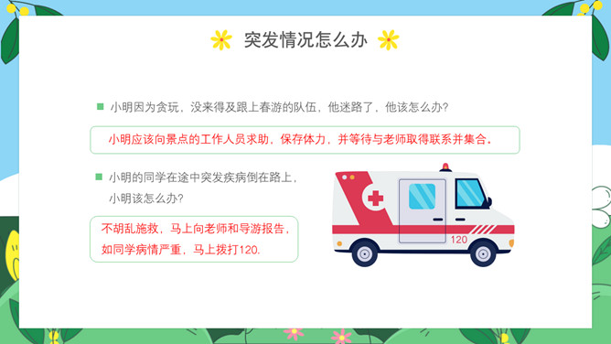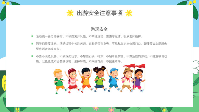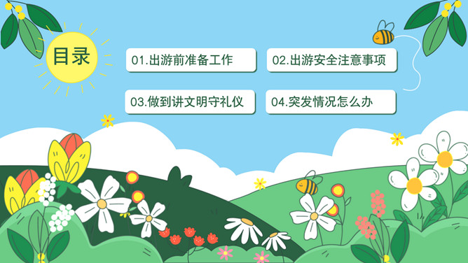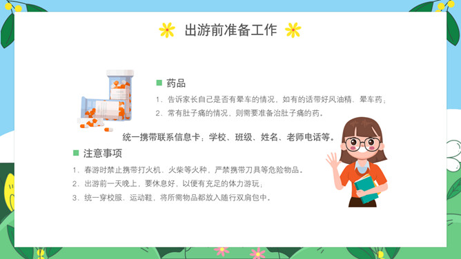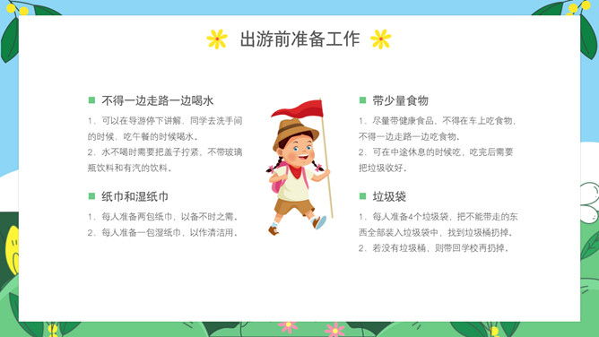 小学生春游安全教育班会PPT模板abby1年前发布关注私信0112224小学生春游安全教育班会PPT模板此内容为付费资源,请付费后查看R1黄金会员免费钻石会员免费立即购买您当前未登录!建议登陆后购买,可保存购买订单付费资源已售 18 小学生春游安全教育PPT模板。内容包括出游前准备工作、出游安全注意事项、做到讲文明守礼仪、突发情况怎么办。 © 版权声明文章版权归作者所有,未经允许请勿转载。THE ENDPPT模版 喜欢就支持一下吧点赞24 分享QQ空间微博QQ好友海报分享复制链接收藏