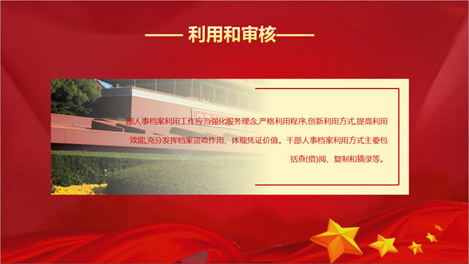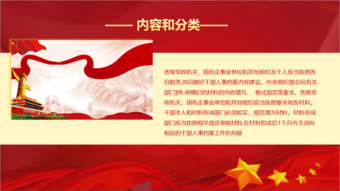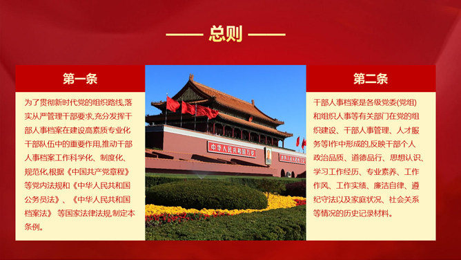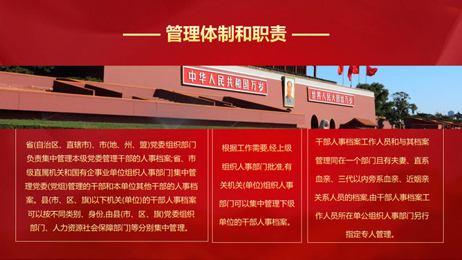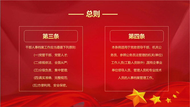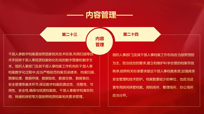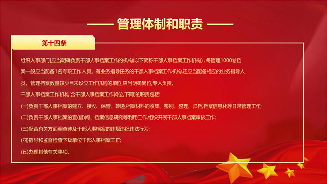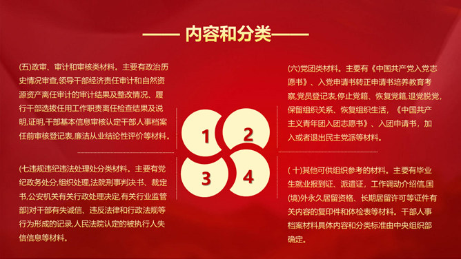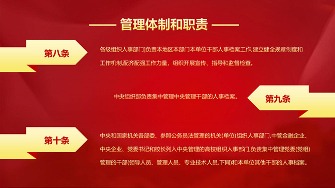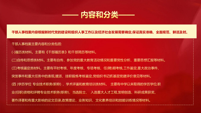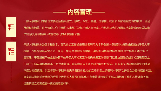 干部人事档案工作条例PPT模板abby1年前发布关注私信04368干部人事档案工作条例PPT模板此内容为付费资源,请付费后查看R1黄金会员免费钻石会员免费立即购买您当前未登录!建议登陆后购买,可保存购买订单付费资源已售 19 干部人事档案工作条例PPT模板。第一章 总则、第二章 管理体制和职责、第三章 内容和分类、第四章 日常管理、第五章 利用和审核、第六章 附则。 © 版权声明文章版权归作者所有,未经允许请勿转载。THE ENDPPT模版 喜欢就支持一下吧点赞8 分享QQ空间微博QQ好友海报分享复制链接收藏
