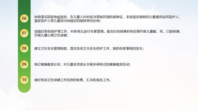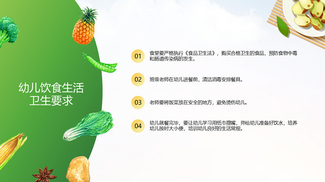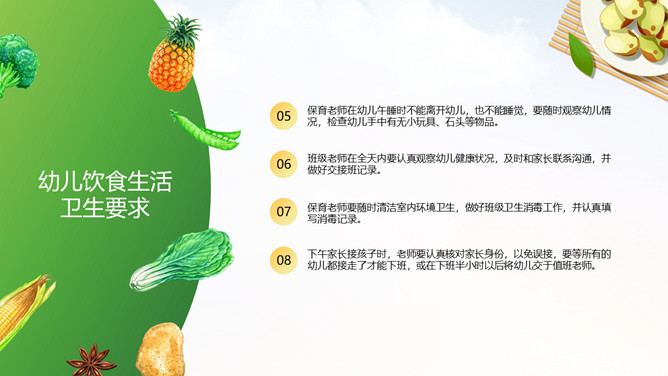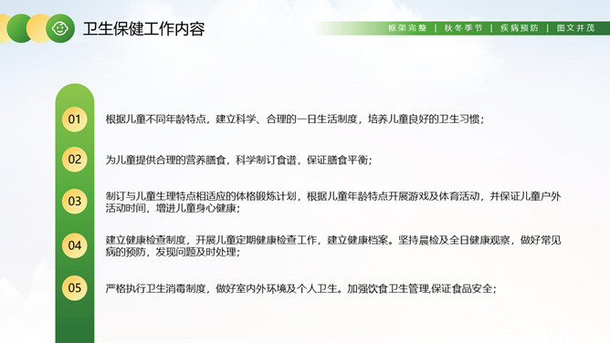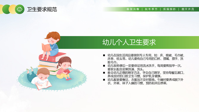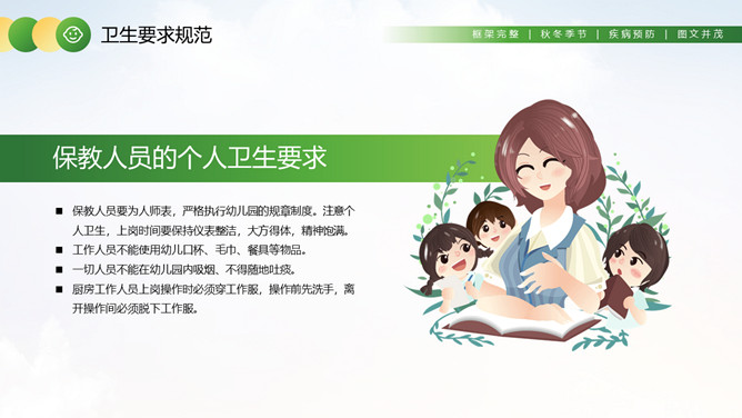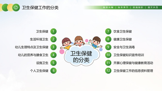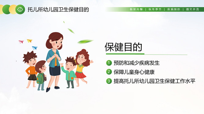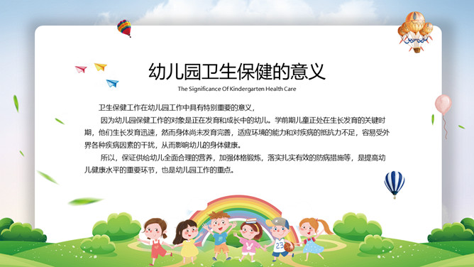 幼儿园卫生保健知识培训PPT模板。卫生保健工作在幼儿园工作中具有特别重要的意义,因为幼儿园保健工作的对象是正在发育和成长中的幼儿。学前期儿童正处在生长发育的关键时期,他们生长发育迅速,然而身体尚未发育完善,适应环境的能力和对疾病的抵抗力不足,容易受外界各种疾病因素的干扰,从而影响幼儿的身体健康。