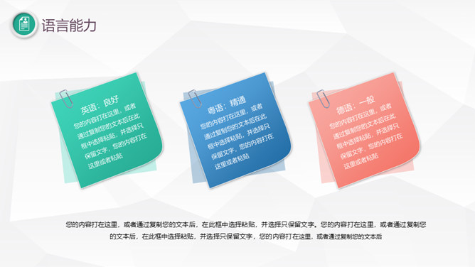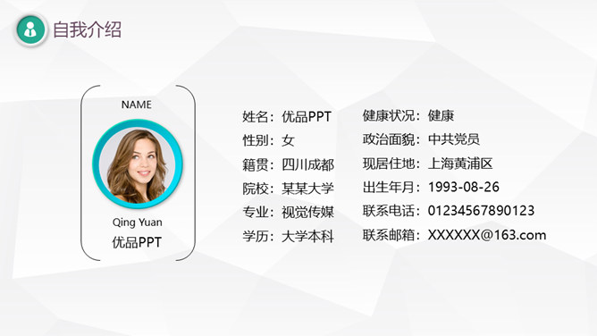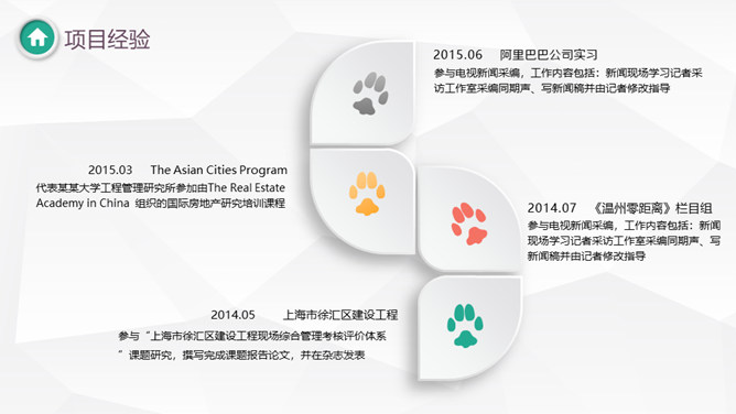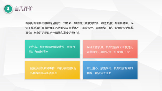 彩色个人求职简历PPT模板abby1年前发布关注私信0212520彩色个人求职简历PPT模板此内容为付费资源,请付费后查看R1黄金会员免费钻石会员免费立即购买您当前未登录!建议登陆后购买,可保存购买订单付费资源已售 3 彩色个人求职简历PPT模板。一套个人简历幻灯片模板,清新多彩配色,灰色低面多边形背景,简约设计。 © 版权声明文章版权归作者所有,未经允许请勿转载。THE ENDPPT模版 喜欢就支持一下吧点赞20 分享QQ空间微博QQ好友海报分享复制链接收藏