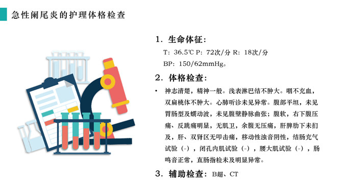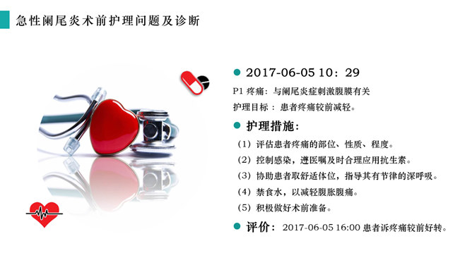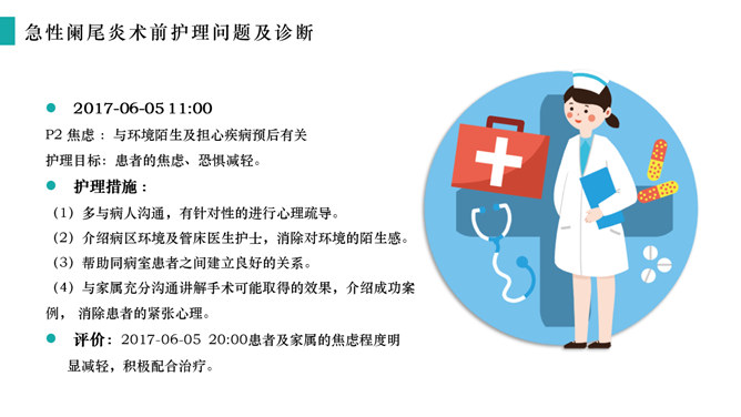 急性阑尾炎护理查房治疗PPT模板abby1年前发布关注私信020484急性阑尾炎护理查房治疗PPT模板此内容为付费资源,请付费后查看R1黄金会员免费钻石会员免费立即购买您当前未登录!建议登陆后购买,可保存购买订单付费资源已售 3 急性阑尾炎护理查房治疗PPT模板。了解急性阑尾炎的处理原则、掌握临床表现和健康教育,病例介绍,护理问题及措施。 © 版权声明文章版权归作者所有,未经允许请勿转载。THE ENDPPT模版 喜欢就支持一下吧点赞4 分享QQ空间微博QQ好友海报分享复制链接收藏