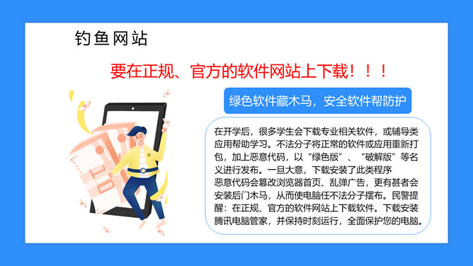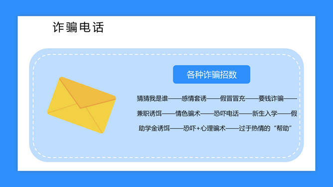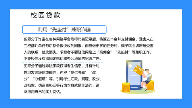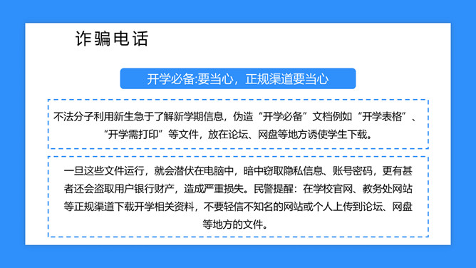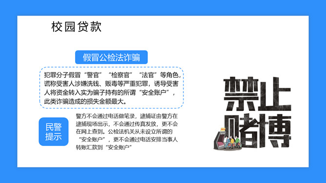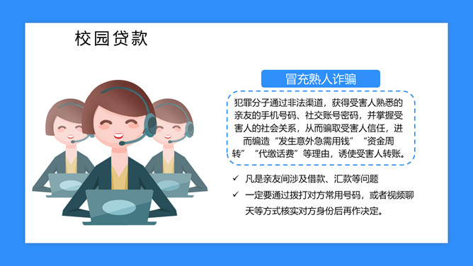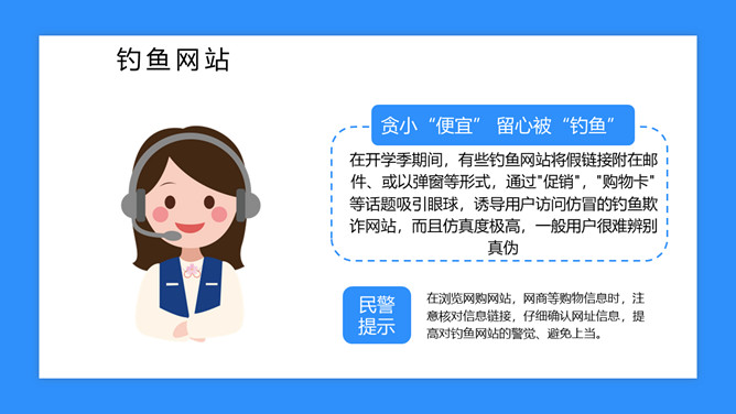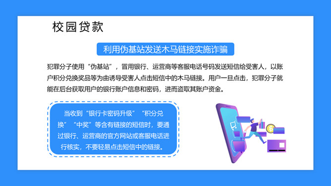 校园防骗指南主题班会课件PPT模板abby1年前发布关注私信019017校园防骗指南主题班会课件PPT模板此内容为付费资源,请付费后查看R1黄金会员免费钻石会员免费立即购买您当前未登录!建议登陆后购买,可保存购买订单付费资源已售 6 校园防骗指南主题班会课件PPT模板。包括诈骗电话、钓鱼网站、校园贷款等内容。 © 版权声明文章版权归作者所有,未经允许请勿转载。THE ENDPPT模版 喜欢就支持一下吧点赞7 分享QQ空间微博QQ好友海报分享复制链接收藏