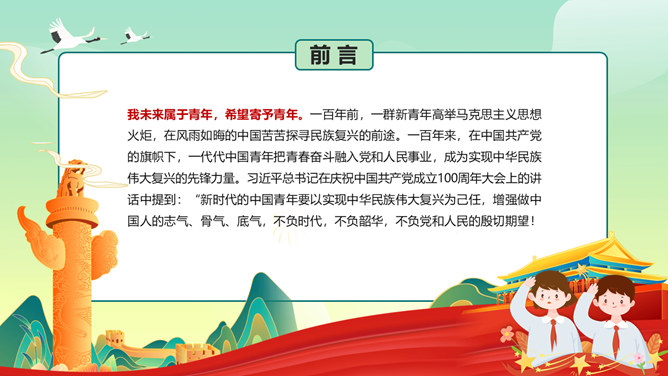 爱国教育主题班会PPT模板abby1年前发布关注私信0179017爱国教育主题班会PPT模板此内容为付费资源,请付费后查看R1黄金会员免费钻石会员免费立即购买您当前未登录!建议登陆后购买,可保存购买订单付费资源已售 12 爱国教育主题班会PPT模板。一百年来,在中国共产党的旗帜下,一代代中国青年把青春奋斗融入党和人民事业,成为实现中华民族伟大复兴的先锋力量。 © 版权声明文章版权归作者所有,未经允许请勿转载。THE ENDPPT模版 喜欢就支持一下吧点赞17 分享QQ空间微博QQ好友海报分享复制链接收藏
