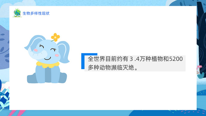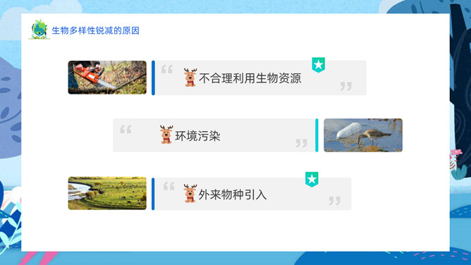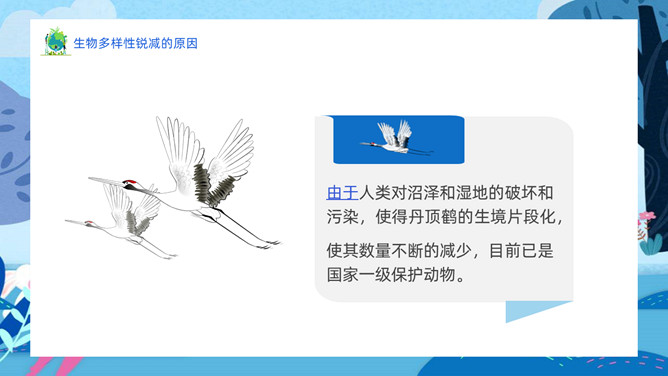 生物多样性保护PPT模板abby1年前发布关注私信0224213生物多样性保护PPT模板此内容为付费资源,请付费后查看R1黄金会员免费钻石会员免费立即购买您当前未登录!建议登陆后购买,可保存购买订单付费资源已售 17 生物多样性保护PPT模板。内容包括人类和生物的关系、生物多样性的现状、生物多样性锐减的原因、应该如何保护生物。 © 版权声明文章版权归作者所有,未经允许请勿转载。THE ENDPPT模版 喜欢就支持一下吧点赞13 分享QQ空间微博QQ好友海报分享复制链接收藏