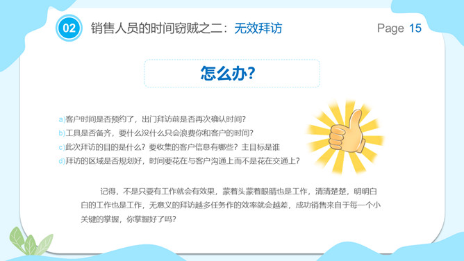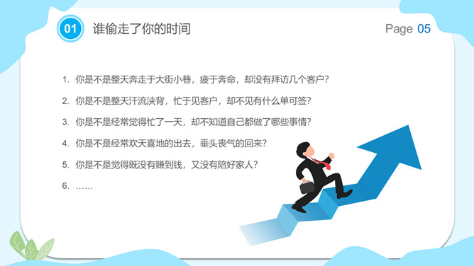 销售部门早会激励PPT模板abby1年前发布关注私信0226221销售部门早会激励PPT模板此内容为付费资源,请付费后查看R1黄金会员免费钻石会员免费立即购买您当前未登录!建议登陆后购买,可保存购买订单付费资源已售 8 销售部门早会激励PPT模板。你是不是整天奔走于大街小巷,疲于奔命,却没有拜访几个客户?你是不是整天汗流浃背,忙于见客户,却不见有什么单可签?你是不是经常觉得忙了一天,却不知道自己都做了哪些事情? © 版权声明文章版权归作者所有,未经允许请勿转载。THE ENDPPT模版 喜欢就支持一下吧点赞21 分享QQ空间微博QQ好友海报分享复制链接收藏